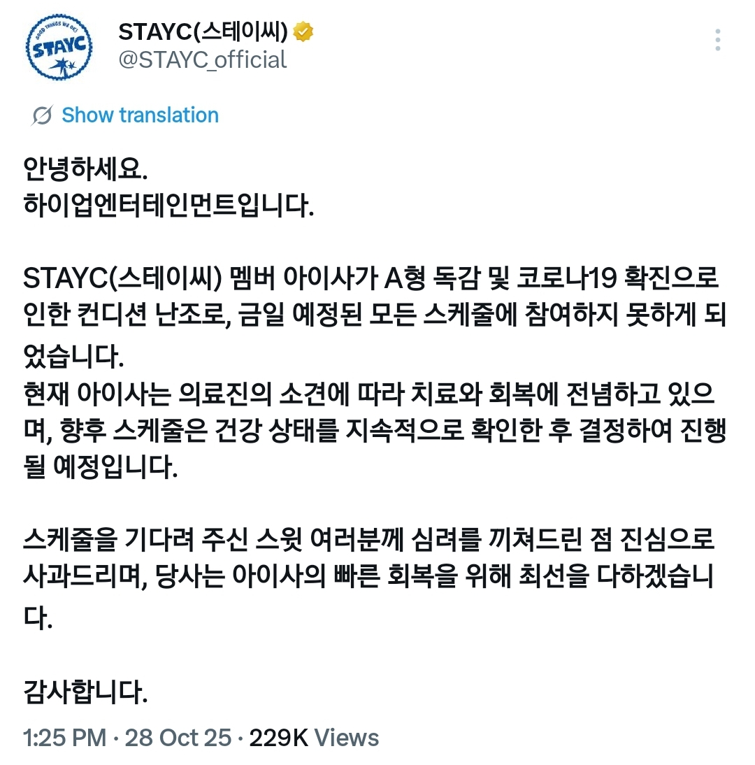 "Karena memburuknya kondisi kesehatan akibat diagnosis influenza tipe A dan COVID-19, member STAYC Isa tidak akan dapat berpartisipasi dalam semua aktivitas yang dijadwalkan untuk hari ini," tulis agensi.