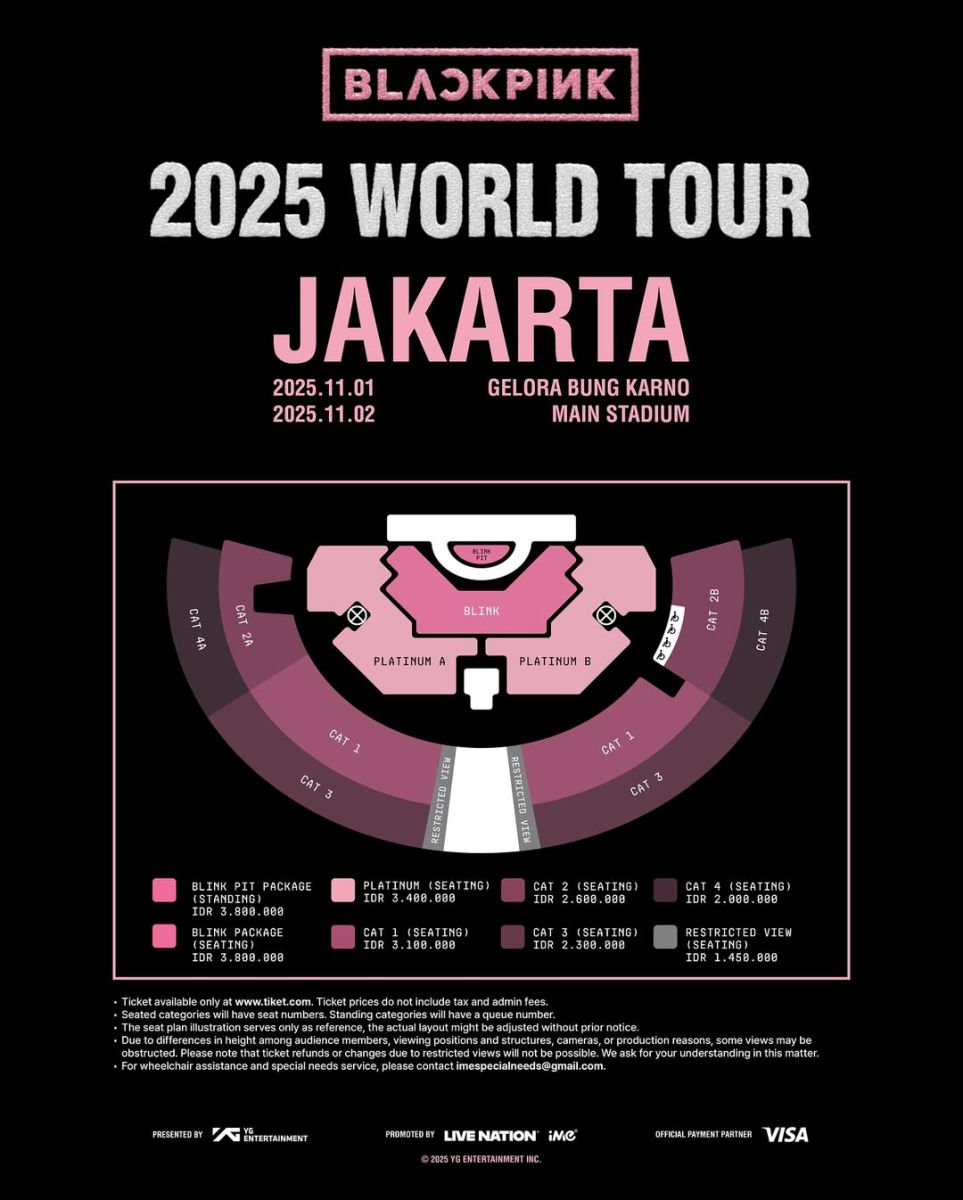Benefit: Blink Pit Package One (1) VIP Pit Ticket Standing atau Blink Package One (1) VIP Ticket Seating, One (1) VIP Gift Set, VIP Laminate & Lanyard, dan Dedicated Merch Booth