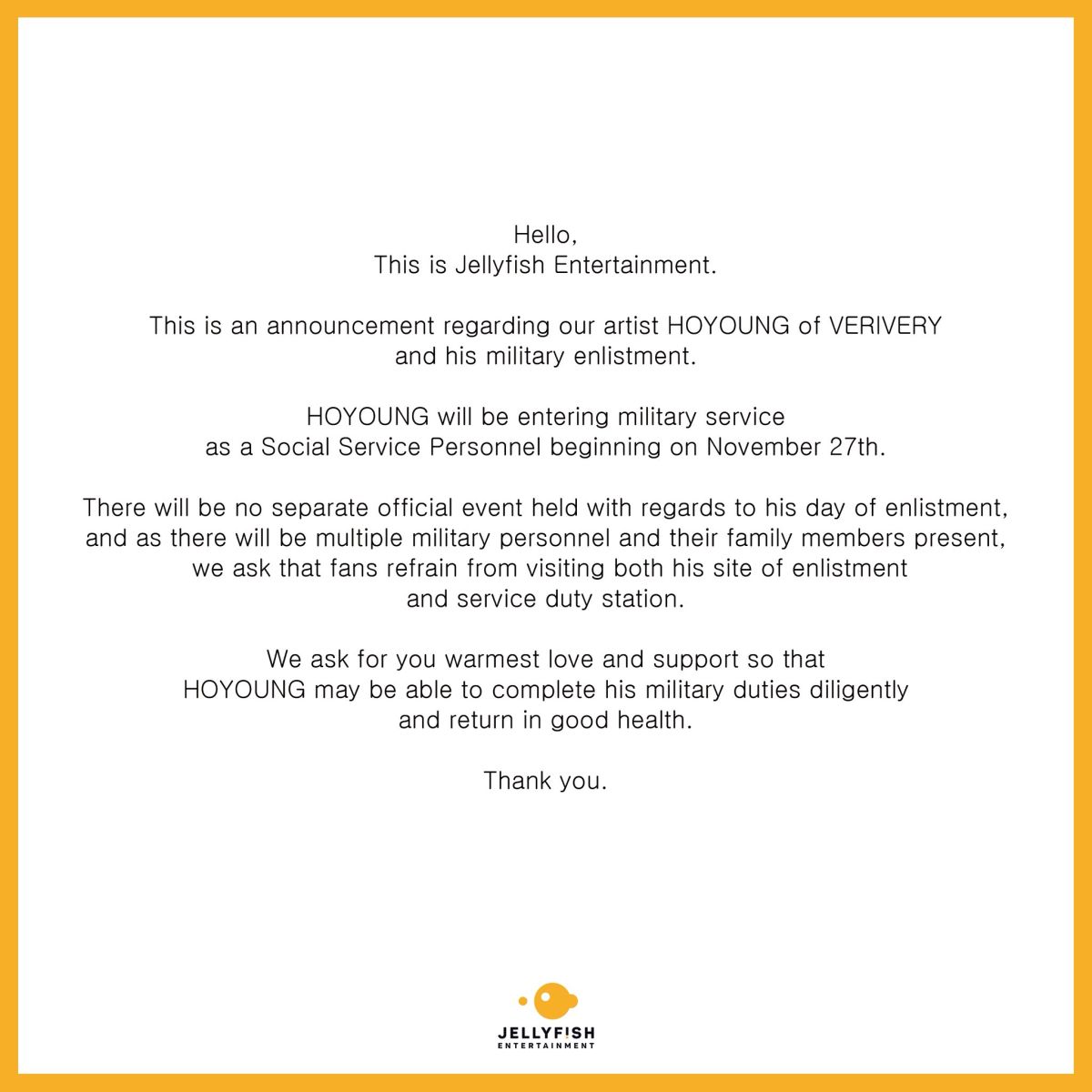 Jellyfish Entertainment melalui pernyataan resminya pada 17 November menyampaikan, “Hoyoung akan masuk pusat pelatihan pada 27 November untuk menjalani pelatihan dasar militer dan melanjutkan tugas sebagai pekerja layanan sosial. Tidak akan ada acara resmi terpisah pada hari masuk pusat pelatihan.”