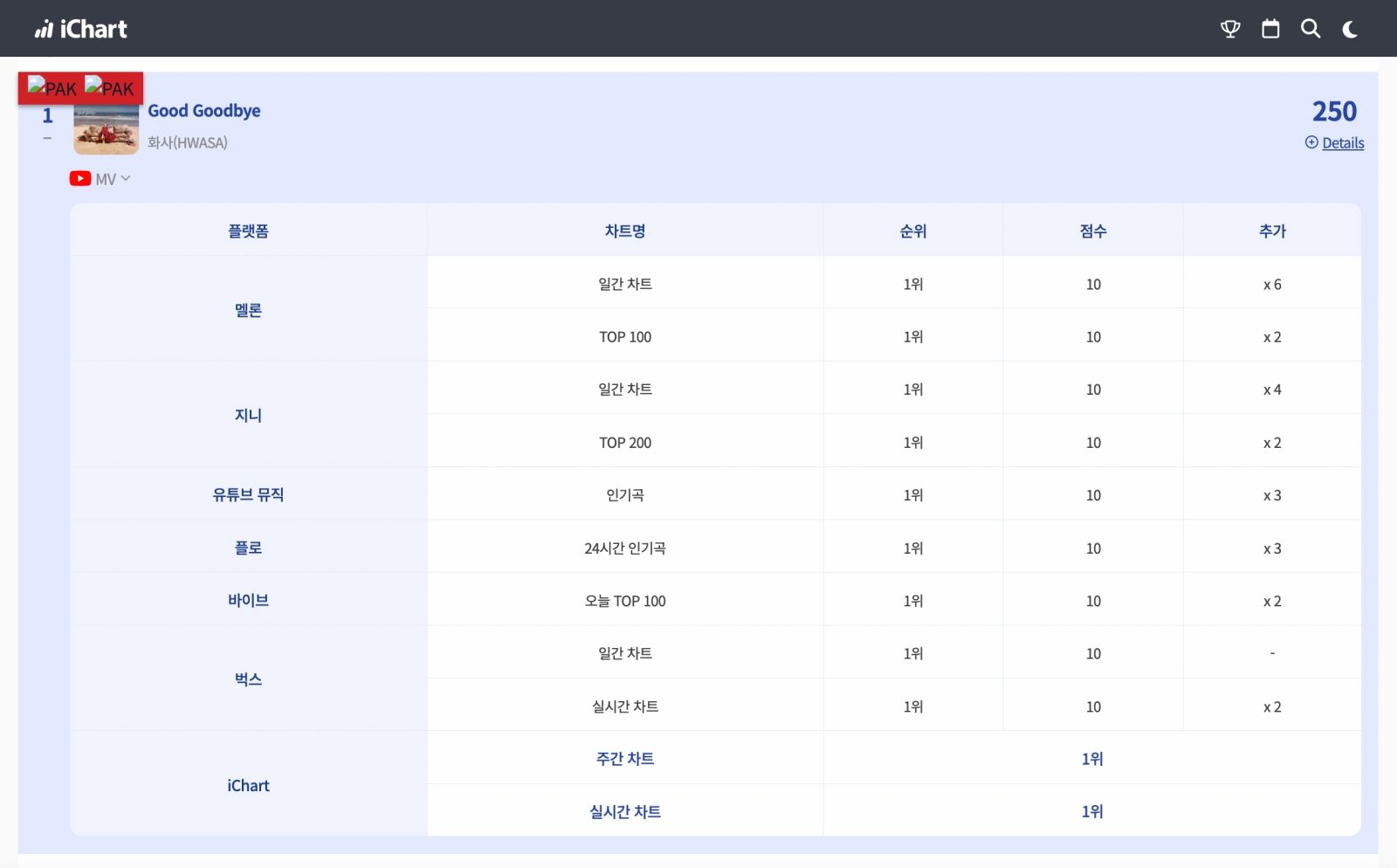 Pada 30 November pukul 10:30 KST, Instiz iChart secara resmi mengumumkan bahwa 'Good Goodbye' berhasil meraih Perfect All-Kill (PAK), menjadikan Hwasa sebagai solois wanita pertama yang mencapai prestasi ini sepanjang tahun 2025.