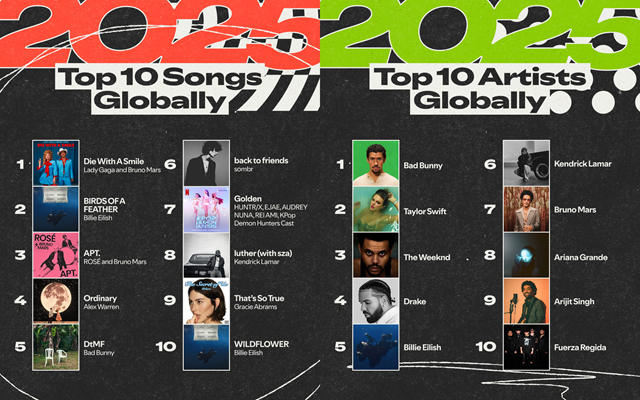 Secara global, artis dengan streaming tertinggi 2025 adalah Bad Bunny, Taylor Swift, The Weeknd, Drake, dan Billie Eilish.