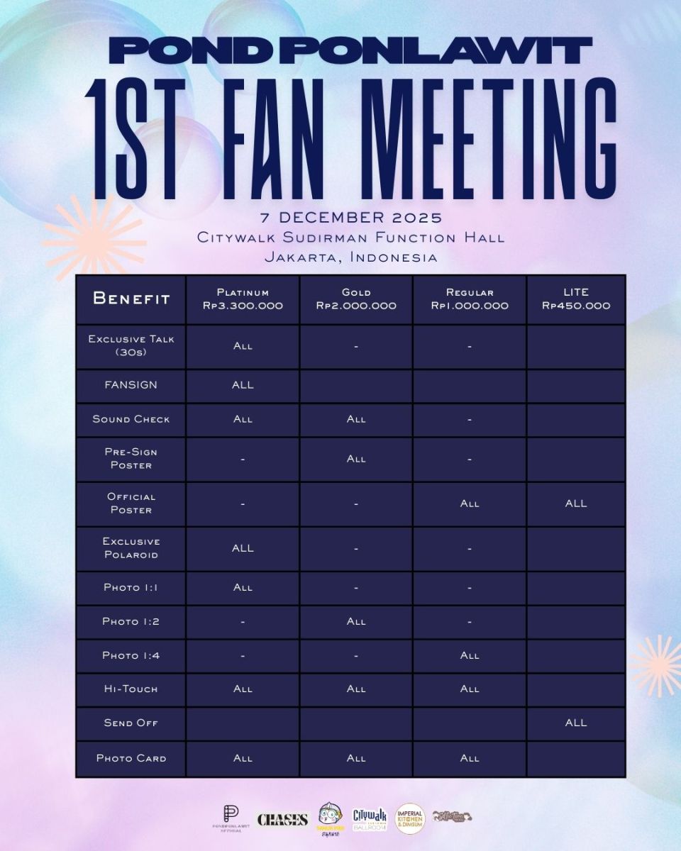 Dipromotori oleh Sanuk Mak, acara fanmeeting bertajuk "POND PONLAWIT The 1st FAN MEETING IN JAKARTA" ini akan berlangsung pada Minggu, 7 Desember 2025 di Citywalk Sudirman Function Hall mulai pukul 12:00 hingga 21:00 WIB.