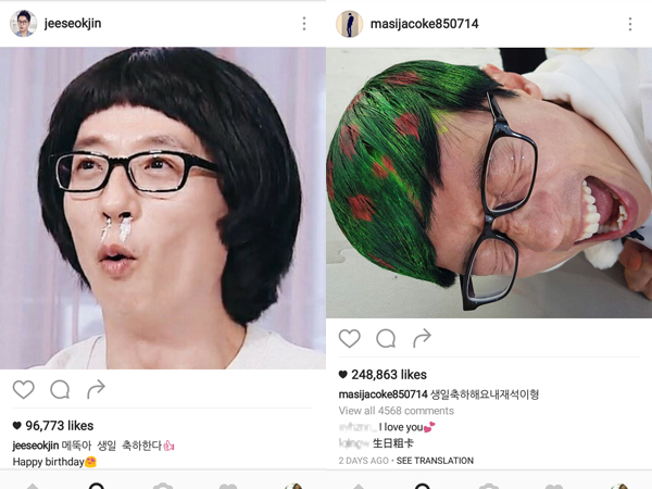 Melalui akun Instagram pribadinya, Ji Suk Jin mengunggah sebuah foto memalukan Yoo Jae Suk yang pastinya memancing tawa. Dalam foto tersebut terlihat sang MC Nasional yang memiliki lendir atau ingus buatan di bawah hidungnya. “Selamat ulang tahun Grasshopper,” tulis Ji Suk Jin sebagai caption.
