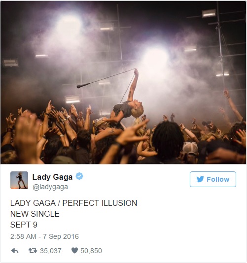 Single yang bertajuk 'Perfect Illusion' tersebut akan rilis pada 9 September mendatang. Melalui Twitter pribadinya, Gaga mengumumkan bersamaan dengan foto yang sepertinya diambil dari video klip lagu tersebut.