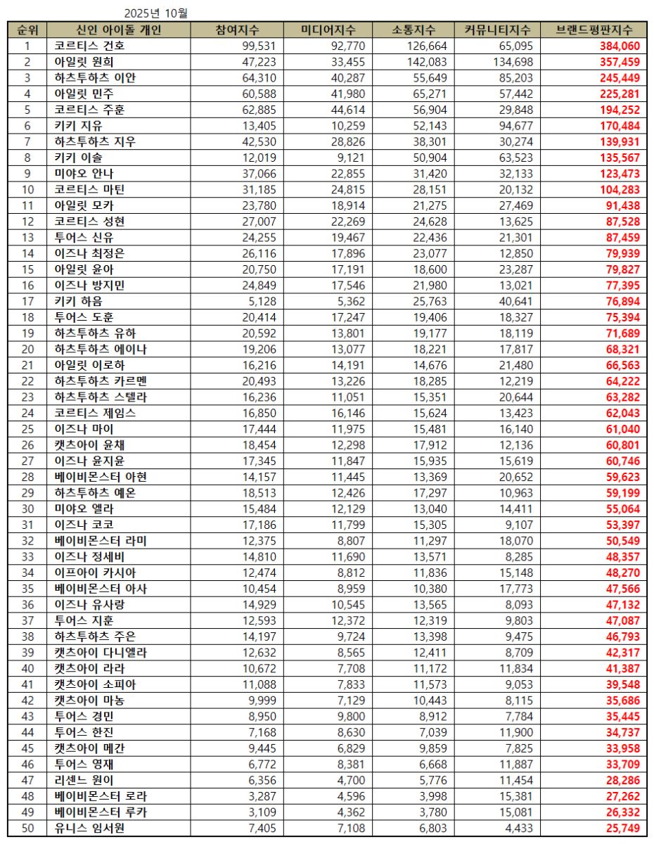 DREAMERS.ID - Berdasarkan analisis big data reputasi brand individu idol pendatang baru untuk Oktober 2025 yang dilakukan oleh Korean Corporate Reputation Research Institute, Keonho CORTIS berhasil menduduki peringkat pertama, diikuti oleh Wonhee ILLIT di posisi kedua, dan Ian Hearts2Hearts di posisi ketiga.
