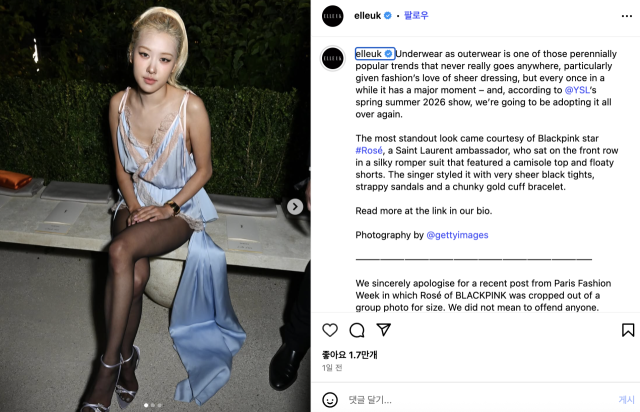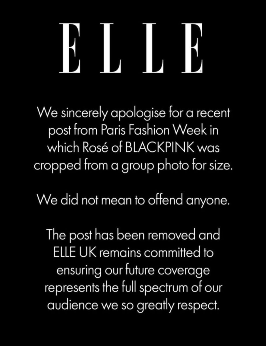 Pada 2 Oktober, Elle UK melalui akun Instagram resminya merilis pernyataan permintaan maaf. "Kami dengan tulus meminta maaf atas pemotongan foto Rose BLACKPINK dari postingan Paris Fashion Week karena masalah ukuran," tulis mereka.