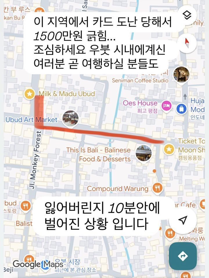 Lewat unggahan di Instagram-nya pada 2 Oktober lalu, Jeon Hye Bin membagikan peta wilayah Ubud sambil curhat. "Aku dicuri kartunya di daerah ini, dan langsung kena tagihan 15 juta won. Buat teman-teman yang lagi di pusat kota Ubud atau mau traveling segera, hati-hati ya! Ini kejadiannya cuma 10 menit setelah kartunya hilang," tulisnya.