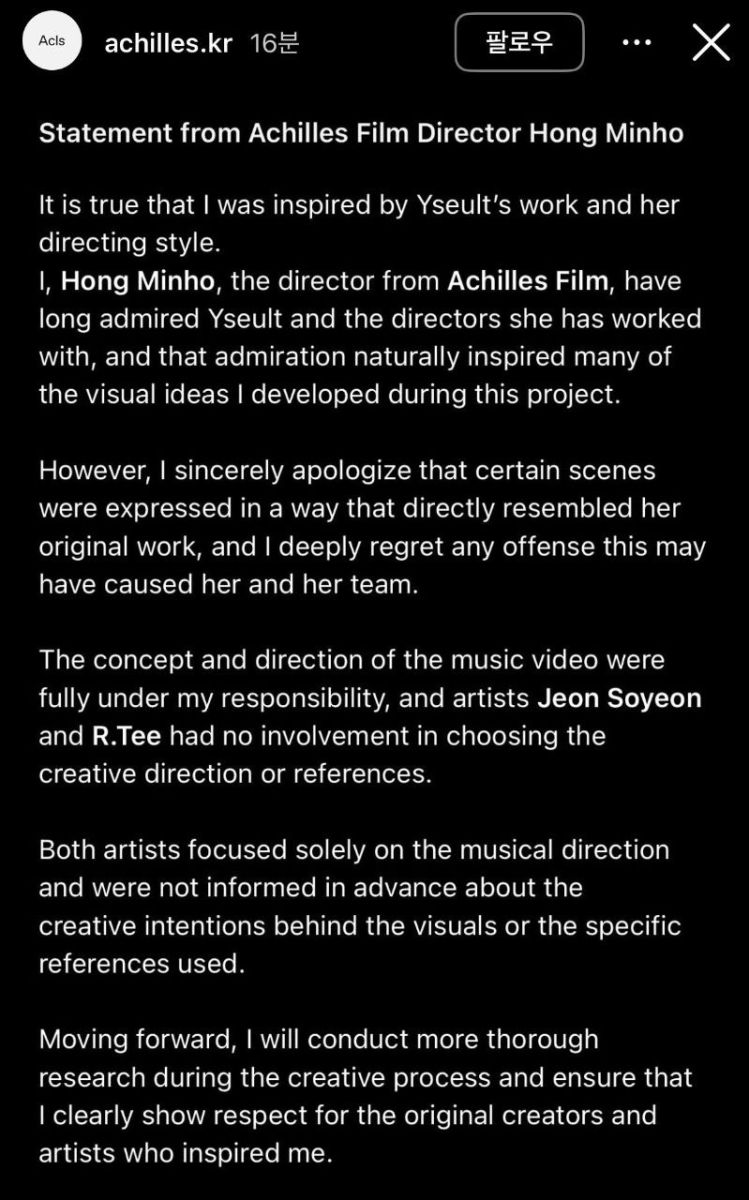 Menyusul tuduhan ini, sutradara video musik, Hong Min Ho dari Achilles Film, mengeluarkan pernyataan resmi untuk meminta maaf. Dia mengakui bahwa karya Yseult dan gaya penyutradaraannya menjadi inspirasi untuk MV 'DAMDADI'.