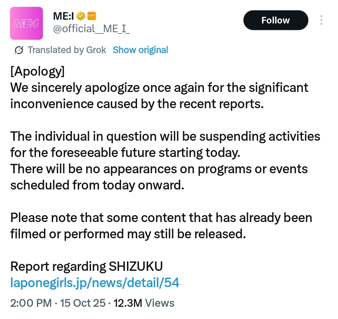 Di sisi lain, Lapone Girls, label di bawah naungan Lapone Entertainment yang menaungi ME:I, juga mengumumkan penghentian sementara aktivitas Shizuku. Dalam pernyataan resmi, mereka menyebut bahwa Shizuku terlibat dalam pelanggaran peraturan perusahaan, tanpa merinci lebih lanjut.