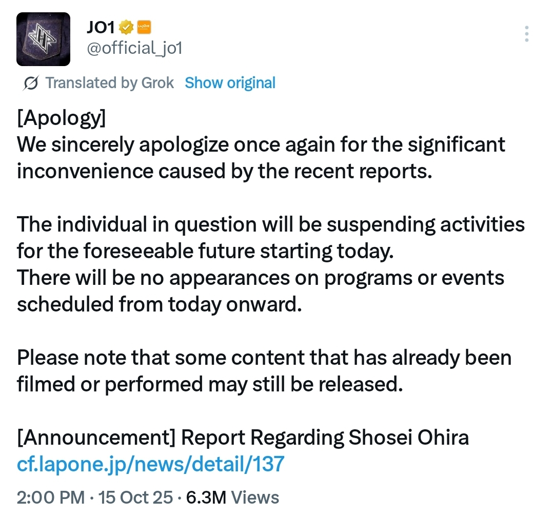 "Tindakan ini dianggap sebagai pelanggaran serius terhadap ekspektasi penggemar, sehingga kami memutuskan untuk menghentikan aktivitasnya untuk sementara waktu mulai hari ini agar ia dapat merefleksikan perbuatannya."