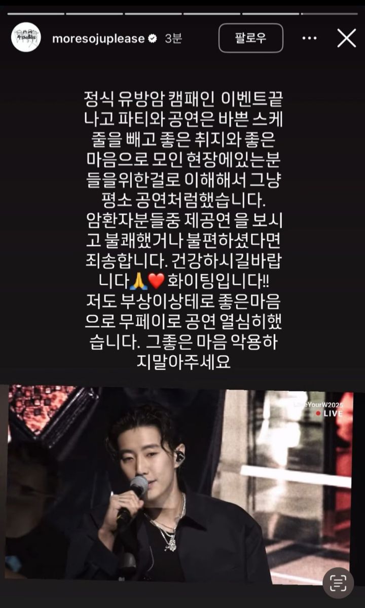 Menanggapi kontroversi, Jay Park menyampaikan permintaan maaf melalui media sosial. “Acara amal resmi telah selesai, dan penampilan di after-party saya anggap sebagai hiburan biasa untuk para tamu yang hadir dengan niat baik. Jika ada pasien kanker yang merasa tersinggung atau tidak nyaman dengan penampilan saya, saya meminta maaf,” ujarnya.