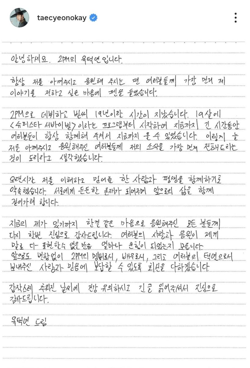 Taecyeon juga menyampaikan rasa syukurnya kepada pasangannya yang telah memahami dan mempercayainya selama ini. "Kami berencana menjalani hidup bersama sebagai penopang satu sama lain di masa depan," lanjutnya.