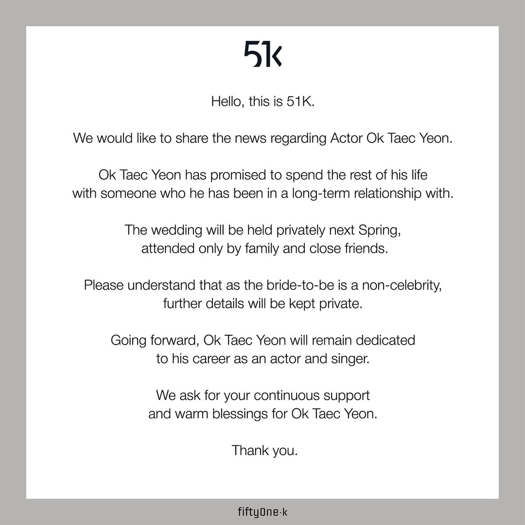 Menurut pernyataan resmi agensi 51K pada 1 November, Taecyeon telah berjanji untuk menghabiskan sisa hidupnya bersama pasangan yang telah menjalin hubungan dengannya selama bertahun-tahun.