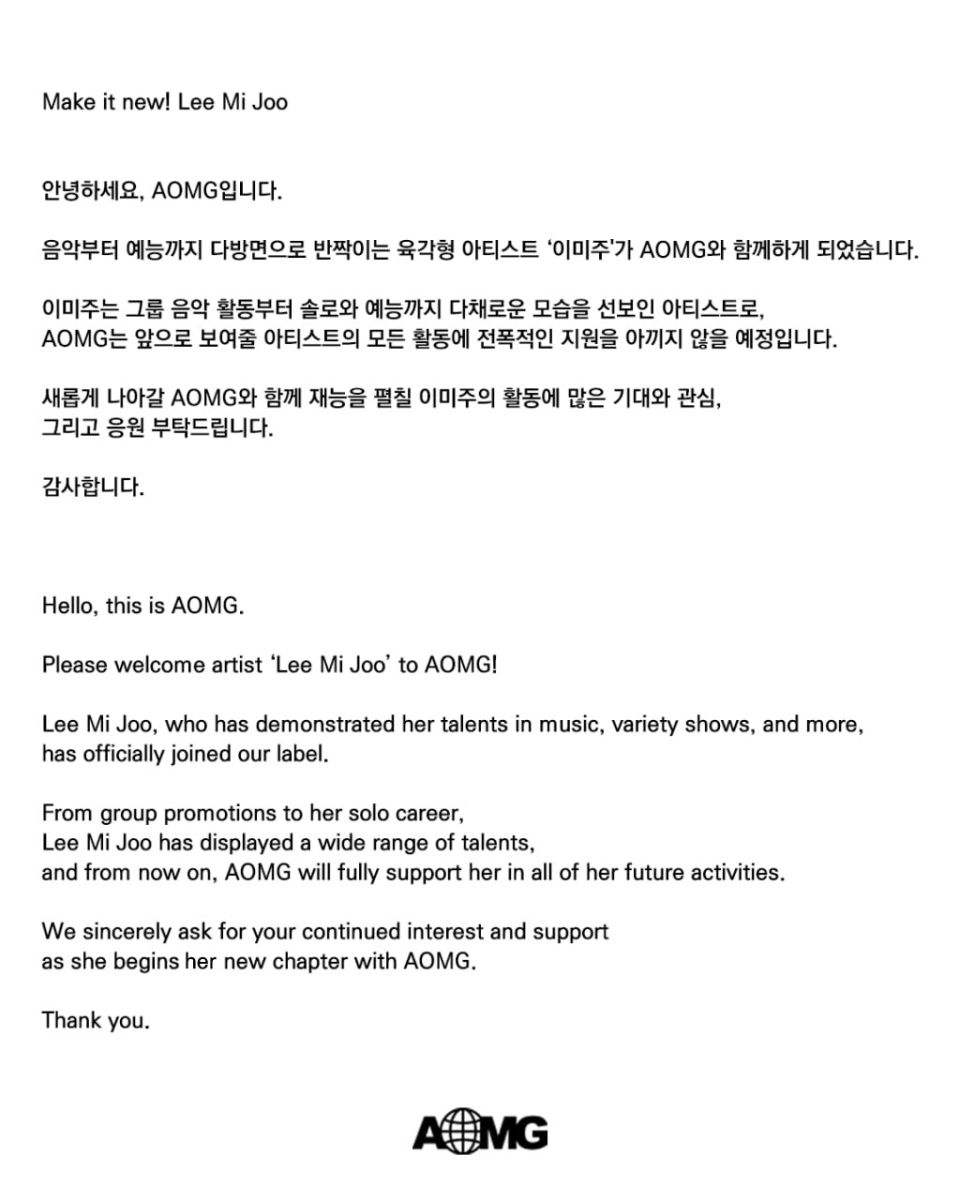 "Dari promosi bersama grup hingga karier solonya, Lee Mijoo telah menampilkan beragam talenta yang luar biasa. Mulai sekarang, AOMG akan memberikan dukungan penuh untuk seluruh aktivitasnya ke depan."