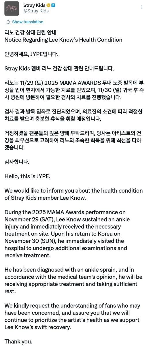 Dalam pernyataan resmi yang dirilis pada 30 November, agensi menyatakan bahwa Lee Know langsung mendapatkan penanganan di lokasi acara setelah cedera terjadi.
