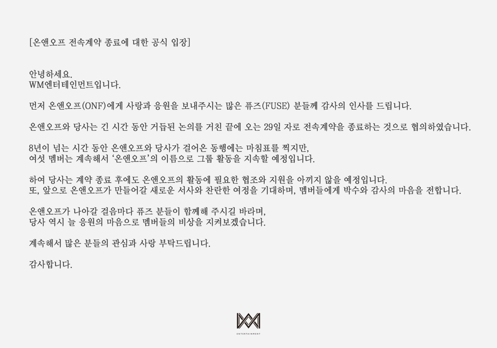 Meski kemitraan selama delapan tahun tersebut kini menemui titik akhirnya, pihak agensi membawa kabar baik bagi para penggemar. Walaupun sudah tidak lagi bernaung di bawah WM Entertainment, keenam anggota—Hyojin, E-Tion, Seungjun, Wyatt, Minkyun, dan U—dipastikan akan tetap melanjutkan aktivitas mereka sebagai satu grup dengan nama ONF.
