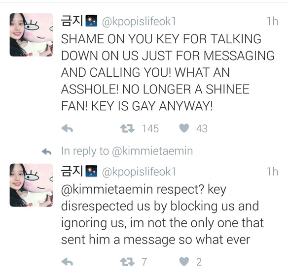 Usut punya usut, ternyata penggemar tersebut kemudian diblokir dari akun chat milik Key. Alhasil, seorang penggemar yang diblokir mengungkapkan kemarahannya di Twitter dengan mengatakan bahwa Key SHINee merupakan seorang Gay.