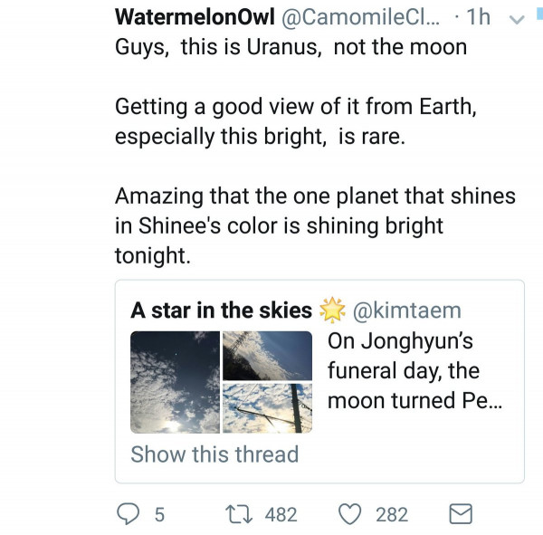 Dari beberapa tweet yang beredar, foto benda bewarna Pearl Aqua tersebut diambil di Jepang. Fenomena ini pun ramai disangkutpautkan dengan prosesi pemakaman Jonghyun yang juga dilakukan hari ini. Tidak sedikit yang menganggap benda tersebut adalah bulan yang tengah berubah warna.