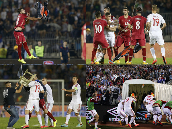 Para pendukung yang berada di tribun juga langsung mencoba merangsek ke lapangan saat mengatahui bendera yang diterbangkan di tengah lapangan itu adalah bendera negara Albania, yang hingga saat ini diketahui masih memiliki konflik politik dengan Serbia.