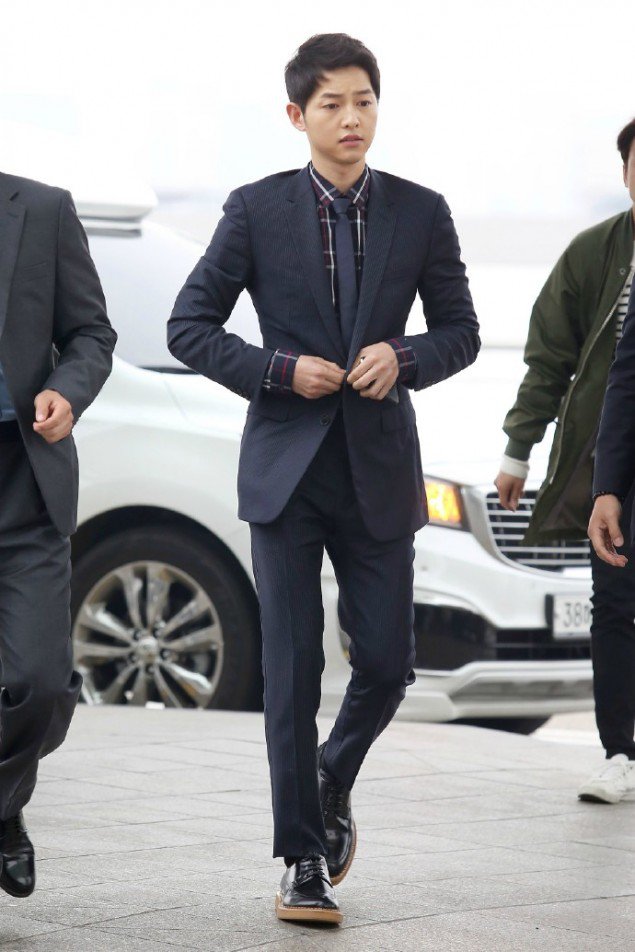 Song Joong Ki terlihat mengenakan setelan jas tersebut saat berada di bandara untuk menghadiri fashion show Dior di Hong Kong. Bintang drama ‘Descendants of the Sun’ ini tampak profesional dengan kancing jas yang dikaitkan. Menyempurnakan penampilannya, ia terlihat mengenakan shiny loafers sebagai sepatunya.