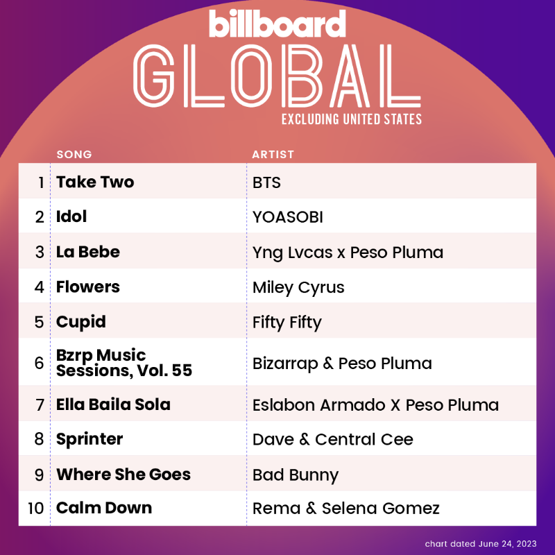 BTS juga menjadi artis pertama yang mencapai No. 1 dengan tujuh lagu berbeda di Global Excl. U.S, menduduki posisi puncak dengan tujuh lagu yang sama dengan Global 200.
