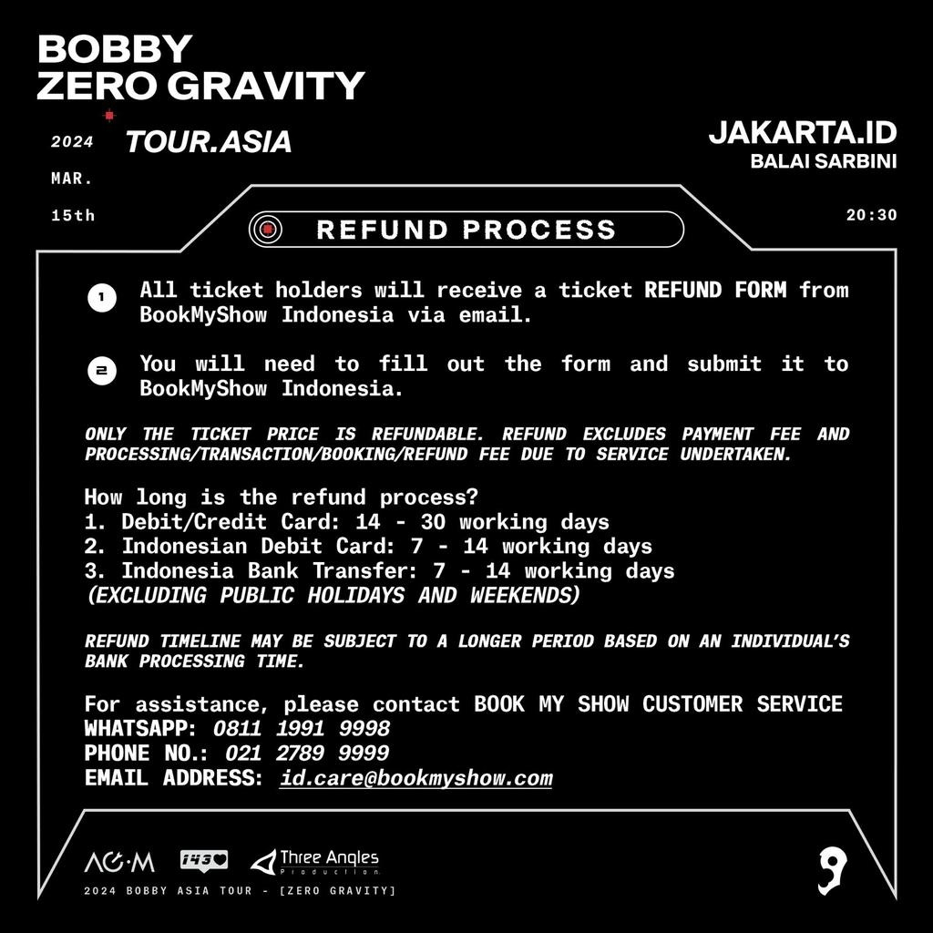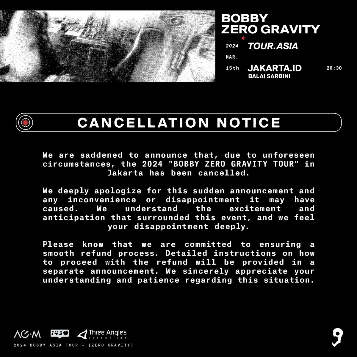 "Dengan sedih kami mengumumkan bahwa, karena keadaan yang tidak terduga, 2024 BOBBY ZERO GRAVITY TOUR in Jakarta telah dibatalkan," tulisnya.