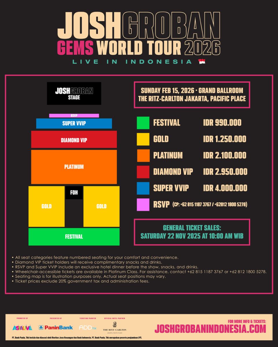 Konser Josh Groban – GEMS World Tour 2026 Presented by Panin Bank dijual dalam tiga tahap: